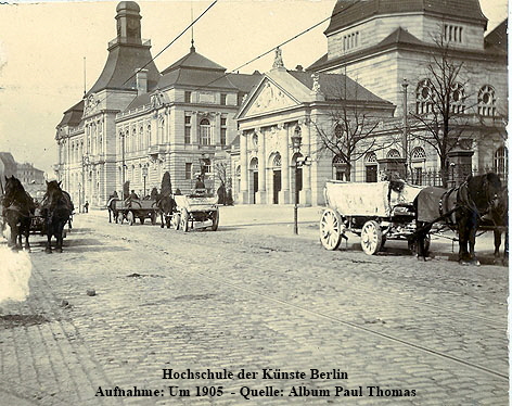 An der Hardenbergstrasse lag schon 1905 die benachbarte „Hochschule der Künste“. Früher war das Architekturangebot ein Bestandteil der Hochschule der Künste, wurde dann aber in die Königlich Technische Hochschule integriert. Es ist eine von der TU Berlin unabhängige Universität der Künste, gehört aber zum Campus-Gelände. Von Paul Thomas stammt aus dem Anfang des 20. Jahrhunderts die folgende Aufnahme der Akademie der Künste, die mit der Aufnahme von der Universität der Künste rund 100 Jahre später ergänzt wird.