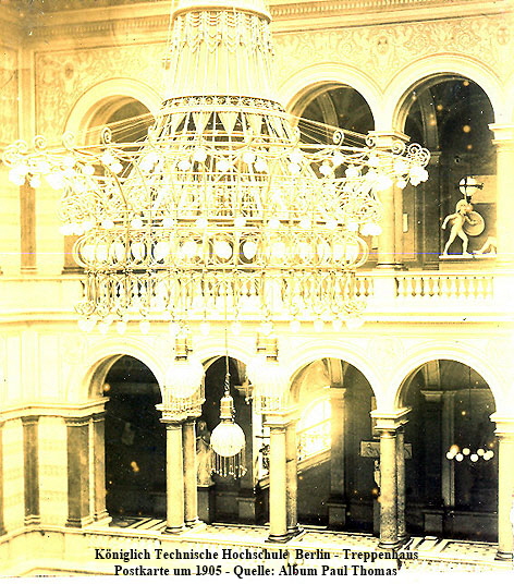 Der große Kronleuchter des Lichthofes ist dem Krieg zum Opfer gefallen. Die nachstehenden Aufnahmen konnten dem Universitätsarchiv der TU Berlin im Jahr 2008 aus der Sammlung von Paul Thomas übermittelt werden.