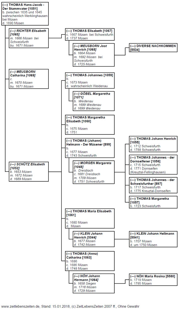 Dieser könnte ein Vorfahr sein, zumal der Hof Meusborn unmittelbar zu Merklinghausen gehörte und „Thomas“ ein absolut seltener Name war. Aufgrund des Geburtsdatums 1592 könnte dieser Thomas Meusborn allenfalls als Vater oder Großvater von Hans Jacob Thomas infrage kommen. Genausogut aber könnte es auch einer der vielen „Johannes“-Nachkommen ein Vorfahr gewesen sein. Durch die Wirren des 30jährigen Krieges, der 1648 endete, ist eine gesicherte Grundlage ohnehin nicht gegeben. Genausogut ist es aber möglich, dass Hans Jacob Thomas außerhalb geboren nach Merklinghusen kam und dann von dort aus ins nahegelegene Müsen heiratete.