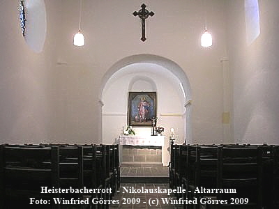 Heisterbacherott ist ein kleiner Stadtteil von Königswinter am Rhein, der bereits 1150 eine kleine Kapelle erhielt. Sie war zunächst dem heiligen Markus gewidmet. Im 30jährigen Krieg weitgehend zerstört, wurde sie 1676 wieder aufgebaut, verändert und nun dem heiligen Nikolaus gewidmet..Mit dem daneben liegenden Fronhof (heute “Haus Schlesien”) war sie von ca. 1150 bis 1803 Eigentum des Frauenklosters Schwarzrheindorf. Bis 1891 war die Kapelle dann Besitz des preußischen Staates. und ab 1904 Eigentum der Kapellengemeinde und späteren Pfarrgemeinde Heisterbacherott.