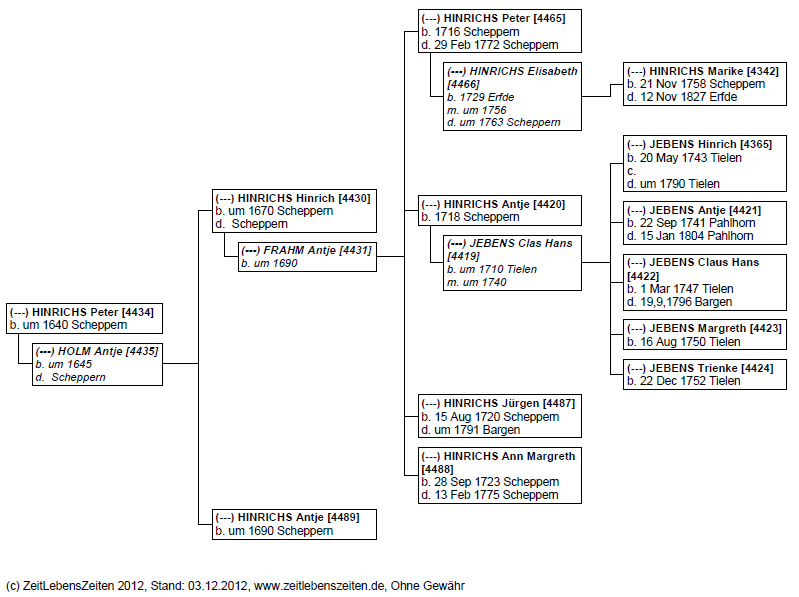 m Hinblick auf die Familie Tiemann erfordert die Betrachtung der Familie Hinrichs aus Scheppern eine besondere Aufmerksamkeit. Die Nachkommen des ältesten bekannten Hinrichs führen nämlich in zwei Linien weiter in der Vorfahrenkette, keine Besonderheit im Dorfleben, aber doch beachtenswert.