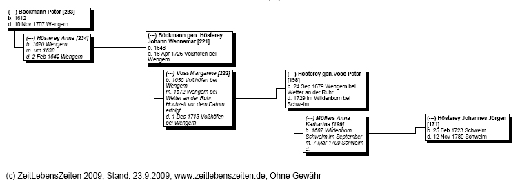 BÖCKMANN GEN. HÖSTEREY Johann Wennemar-221 (Peter) wurde 1648 geboren. Er starb am 18. April 1726 in Voßhöfen bei Wengern. Hösterey war Kirchspielvorstand und Höltings(= Holz-)Richter