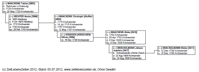 Alcke heiratete BRACKELMANN Johann Joachim-3617 Sohn von BRACKELMANN Johann Joachim-3891 und GERCKENS Anna Gesche-3892. Johann wurde in Ochsenwerder (Hoher Deich) geboren. Er starb am 22. August 1808 in Kirchwerder