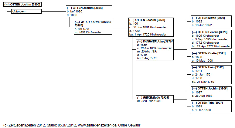 OTTEN Jochim-3890 . Alle genealogischen Angaben zur Familie Otten samt Familien der Ehepartner inkl. Zitate aus Kirchenbüchern etc. folgen den Recherchen von Sabine Paap (Paap-Ahnenforschung) 2011/2012
