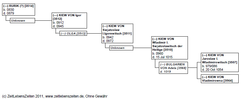 Von Euphrosina von Kiew , die der Rurikiden-Dynastie entstammt führt zur Meissen-Linie des ZeitLebensZeiten-Projektes. Die Generationenfolge seit dem Namensgeber Rurik weist weitere interessante Verbindungen auf. Insgesamt drei Linien führen schließlich zu späteren Ahnen.