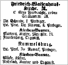 1882 erscheint Wilhelm Nowack naturgemäß nicht mehr im Adressbuch. Bei der Waisenhauskirche ist zu dem Zeitpunkt die Stelle des 2. Predigers nicht besetzt.