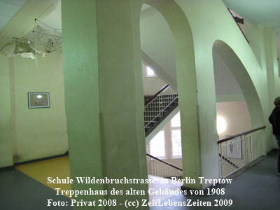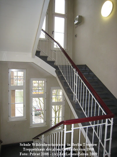 Die Lage der Schule an der Grenze zwischen Berlin Neukölln(West-Berlin) und Berlin Treptow (Ost-Berlin)führte dazu, dass die Schule ab 1961 bis 1989 direkt auf der DDR-Seite an der Mauer und dem dazugehörenden Grenzstreifen lag. Die Schulnutzung ging auch nach dem Fall der Mauer weiter, im Wege der Reformen und Veränderungen gab es viele Wechsel in der Belegung. Die Schulleitung des Jahres 2008 gestattete dankenswerterweise einige Aufnahmen von der Innenarchitektur des Gebäudes zur Dokumentation des Baues von 1908, der im Oktober 1908, also vor gut 100 Jahren eingeweiht wurde. Einige Elemente der Innenarchitektur erinnern an den alten Bau der Technischen Universität in Berlin.