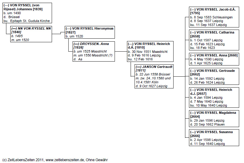 Zur Familiengeschichte der von Ryssels sei auf den Aufsatz von Wolfgang Strubell verwiesen: "Das Leipziger Handelsgeschlecht von Ryssel", erschienen im Heft 2/1989 der Zeitschrift "Genealogie", Seite 440-458. Die Daten wurden für ZeitLebensZeiten weitgehend übernommen. Bei zusammenhängend übernommenen Texten, die kursiv als Zitate kenntlich gemacht werden, wird die Herkunft so angegeben: [Quelle: Strubell].