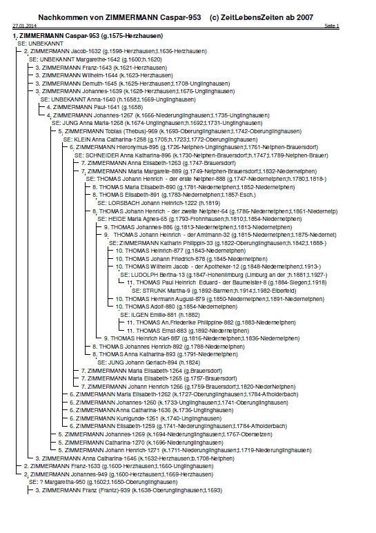 Es gibt zwischen den Familien Thomas und Zimmermann verwandtschaftliche Beziehungen in zwei Linien, da Caspar Zimmermann neben Jacob Zimmermann weitere Kinder hatte. Im Zusammenhang mit den Vorfahren Thomas ist insbesondere sein Sohn Johannes Zimmermann von Interesse. Der nachfolgende Überblick möge es erleichtern: